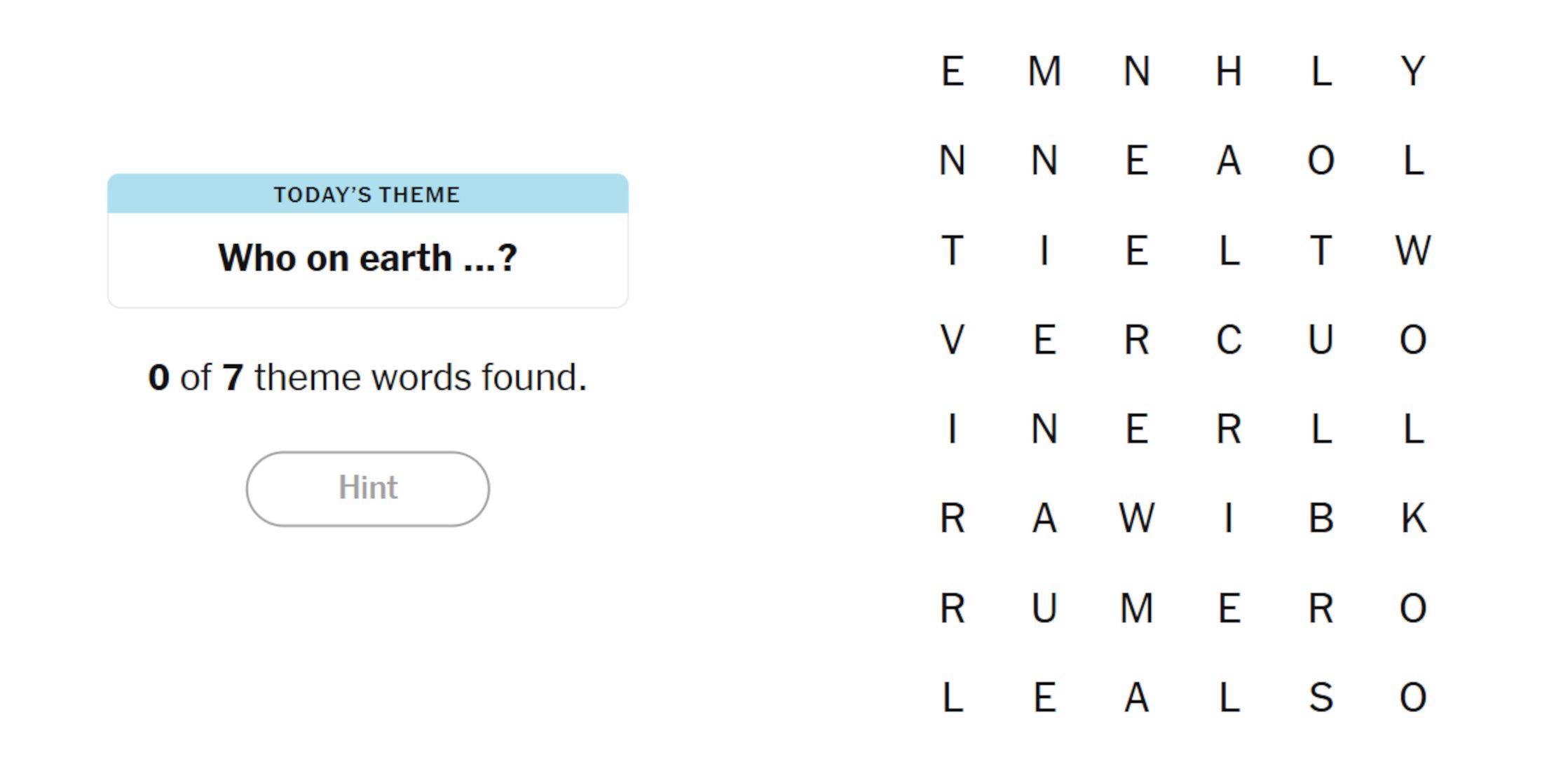 오늘의 스트랜즈 단서는 다음과 같습니다: Who on Earth...? 하나의 스팽그램과 여섯 개의 테마 단어, 총 일곱 개를 찾아야 합니다.