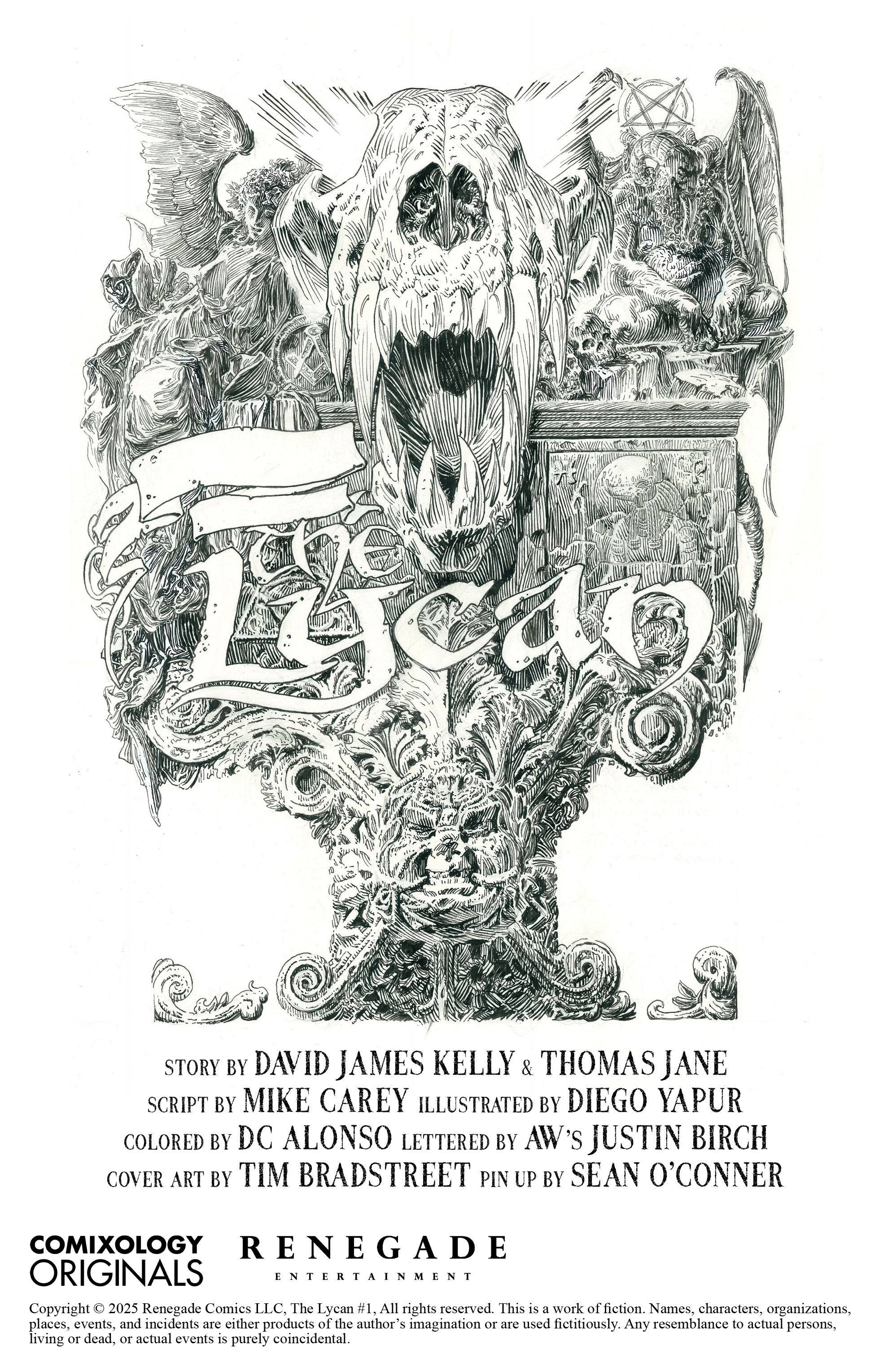 The Lycan, based on a story by Jane and David James Kelly (Logan), features a script by Mike Carey (Lucifer, The Unwritten), art by Diego Yapur, colors by D.C. Alonso, lettering by AndWorld Design, and covers by Tim Bradstreet (Punisher MAX, Hellblazer).